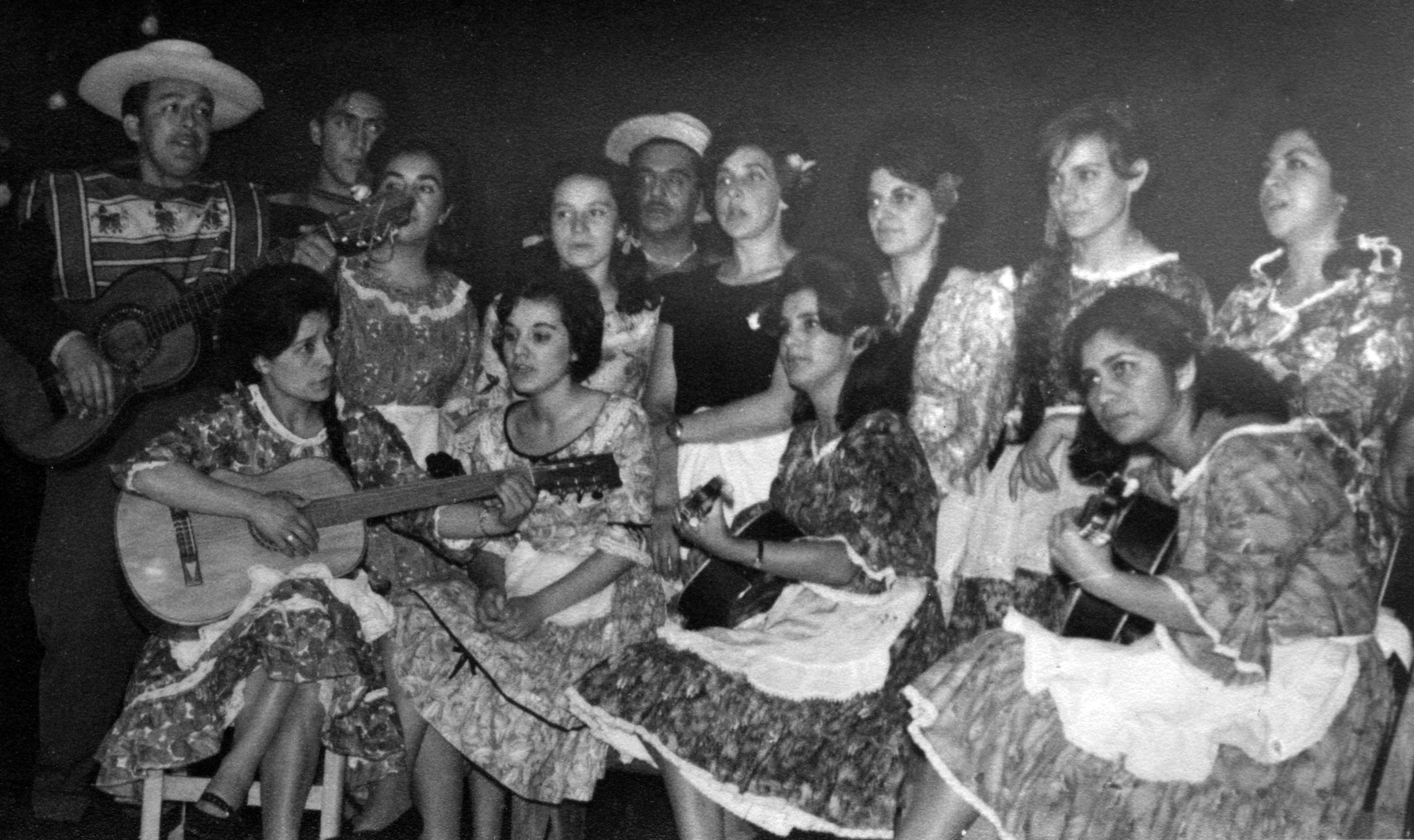Año 1963 – Conjunto folclórico del hospital durante una presentación. Arriba, de izquierda a derecha: Juvencio Vera, Juan Vera, Herta Uribe, Manuel Morales, Nelly Durán, Margarita Julián, Dagmar von Bischoffshausen y Eliana Cerro. Abajo: Herna Oyarzún, Mirta Durán, s.n. y Teresa Delgado.