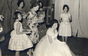 Año 1961 – En el Teatro Municipal, coronación de la Reina del Cincuentenario Marta Kürten por la Sra. Eliana Rosas Asenjo, esposa del alcalde Vicente Montecino. Al lado derecho aparece portando la corona la niña Carmen Montecino, y las damas de honor Maria A. Durán y Juanita Rosas.
