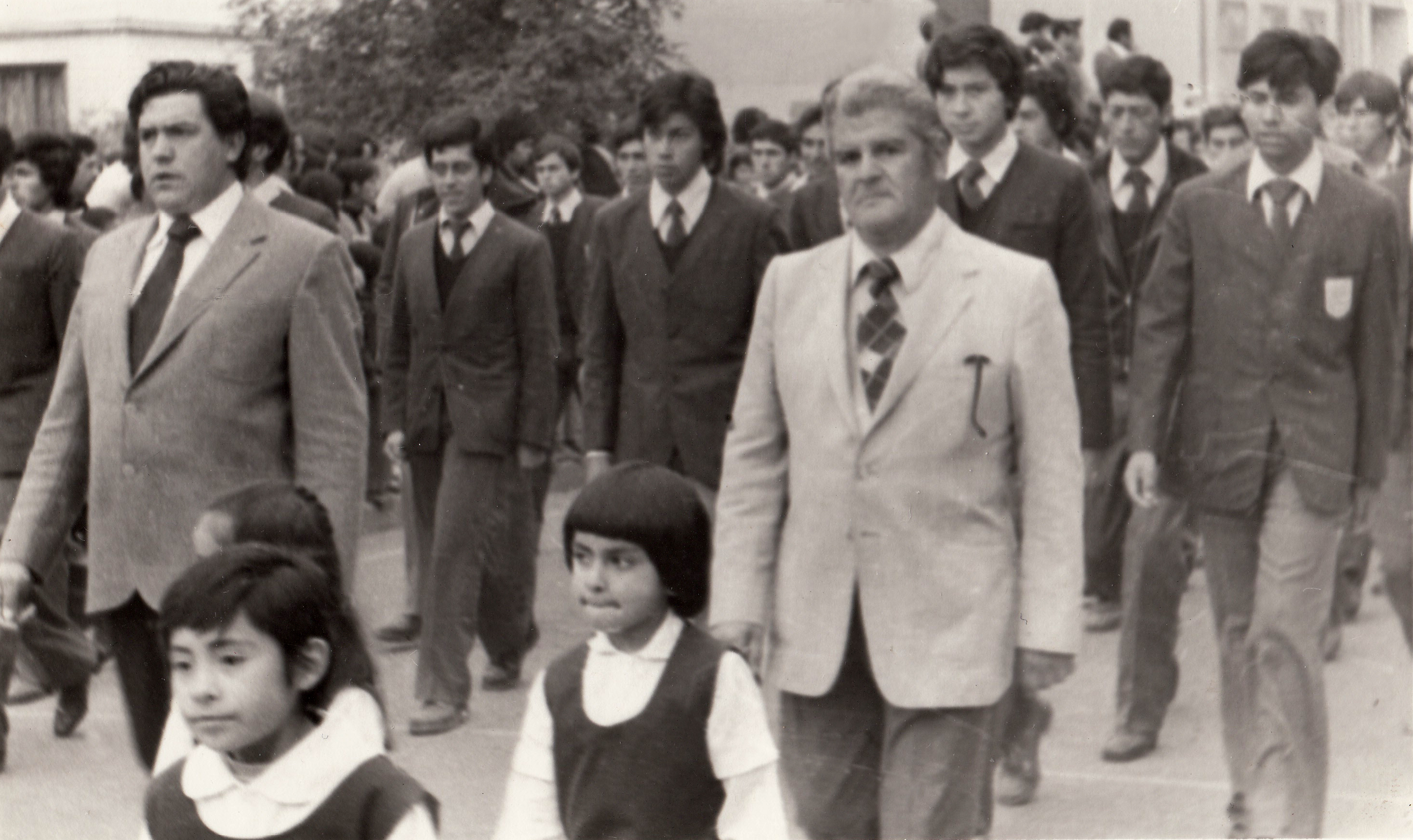 Año 1980 – Desfile del Liceo Luis Bisquert Suzarte -actual Tomás Burgos- en calle Anibal Pinto. En primer plano los profesores Norberto Paredes y Víctor Mutizábal. Atrás los alumnos Claudio Contreras, Luis Palma y N. Coroni entre otros. El Liceo contaba con enseñanza Básica y Media en esos años.