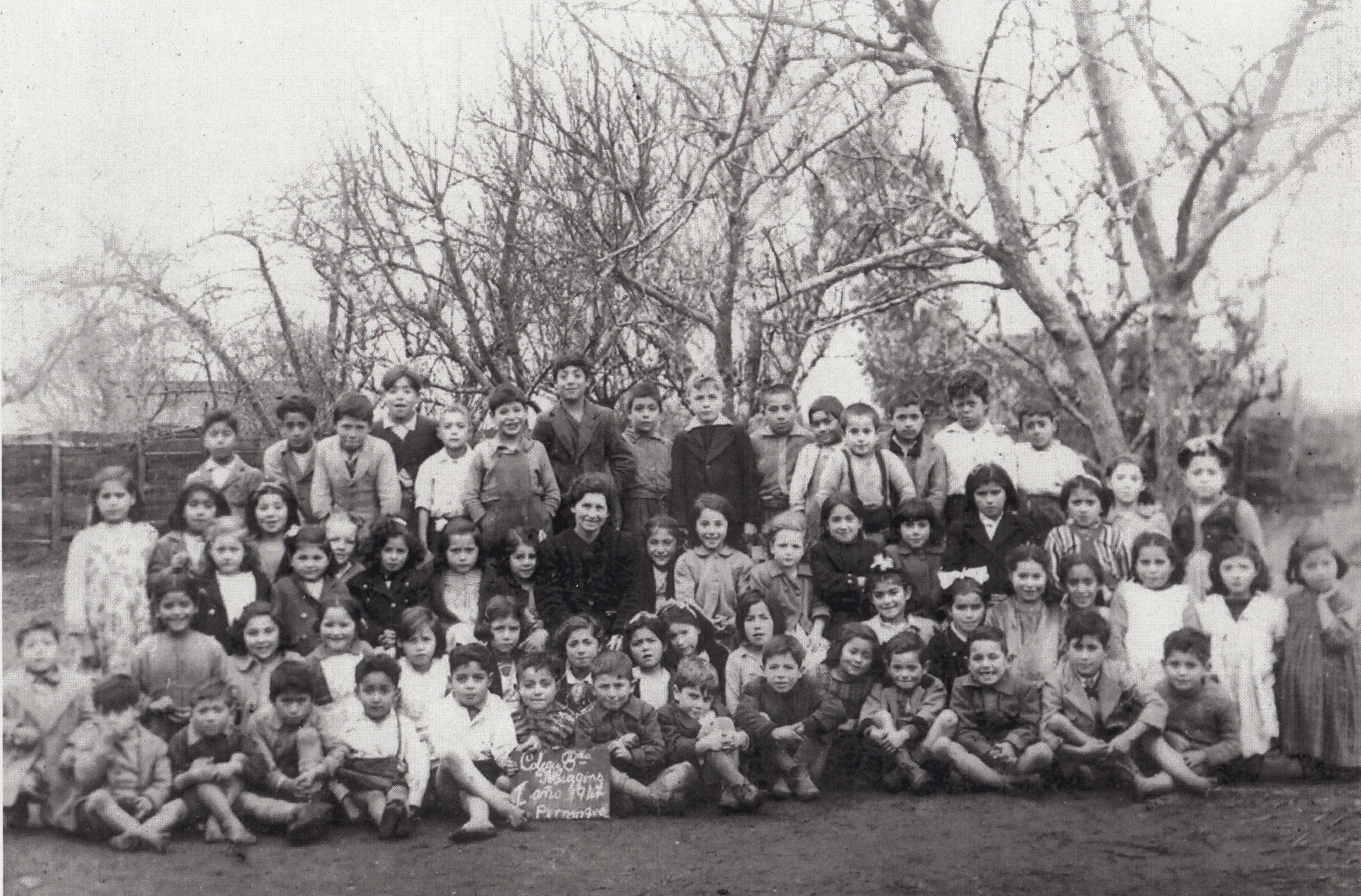 Año 1947 – Alumnos del 1º Año Básico de la Escuela Bernardo O´Higgins con la profesora Sra. Clara Obando. En la fotografía se pueden reconocer a José y Marlis Becker, Silvia Peña, Jaime Prambs, Josefina Tarsiján, Filiberto Palma, Antonio Carrera, Josefina Gutierrez, Leoncio Hinostrosa, Yamil Julian, Juan Poblete y Carlos Kürten entre otros.